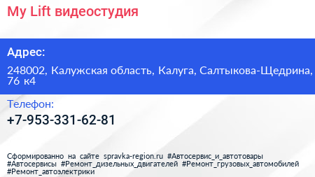My Lift, видеостудия по адресу 248002, Калужская область, Калуга, Салтыкова-Щедрина, 76 к4 в дальнейшем Организация, размещена в следующих категориях:
