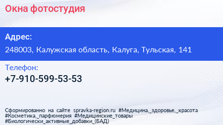 Окна, фотостудия по адресу 248003, Калужская область, Калуга, Тульская, 141 в дальнейшем Организация, размещена в следующих категориях:
