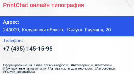PrintChat, онлайн типография по адресу 248000, Калужская область, Калуга, Баумана, 20 в дальнейшем Организация, размещена в следующих категориях: