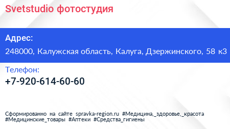 Svetstudio, фотостудия по адресу 248000, Калужская область, Калуга, Дзержинского, 58 к3 в дальнейшем Организация, размещена в следующих категориях: