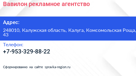 Вавилон, рекламное агентство по адресу 248010, Калужская область, Калуга, Комсомольская Роща, 43 в дальнейшем Организация, размещена в следующих категориях: