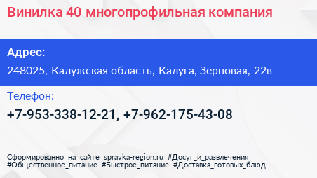 Винилка 40, многопрофильная компания по адресу 248025, Калужская область, Калуга, Зерновая, 22в в дальнейшем Организация, размещена в следующих категориях: