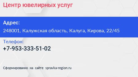 Центр ювелирных услуг по адресу 248001, Калужская область, Калуга, Кирова, 22/45 в дальнейшем Организация, размещена в следующих категориях: