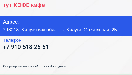тут КОФЕ, кафе по адресу 248018, Калужская область, Калуга, Стекольная, 2Б в дальнейшем Организация, размещена в следующих категориях: