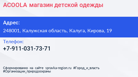 ACOOLA, магазин детской одежды по адресу 248001, Калужская область, Калуга, Кирова, 19 в дальнейшем Организация, размещена в следующих категориях: