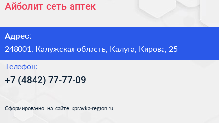 Айболит, сеть аптек по адресу 248001, Калужская область, Калуга, Кирова, 25 в дальнейшем Организация, размещена в следующих категориях: