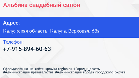 Альбина, свадебный салон по адресу Калужская область, Калуга, Верховая, 68а в дальнейшем Организация, размещена в следующих категориях: