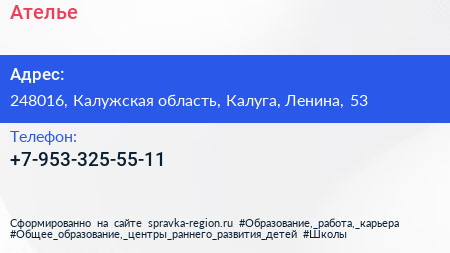 Ателье по адресу 248016, Калужская область, Калуга, Ленина, 53 в дальнейшем Организация, размещена в следующих категориях: