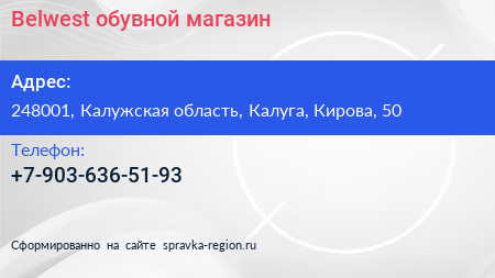 Belwest, обувной магазин по адресу 248001, Калужская область, Калуга, Кирова, 50 в дальнейшем Организация, размещена в следующих категориях: