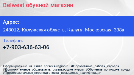 Belwest, обувной магазин по адресу 248012, Калужская область, Калуга, Московская, 338а в дальнейшем Организация, размещена в следующих категориях: