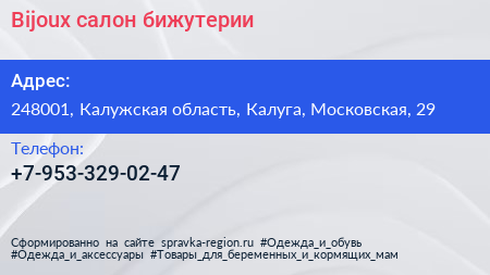 Bijoux, салон бижутерии по адресу 248001, Калужская область, Калуга, Московская, 29 в дальнейшем Организация, размещена в следующих категориях: