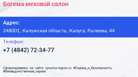 Богема, меховой салон по адресу 248001, Калужская область, Калуга, Рылеева, 44 в дальнейшем Организация, размещена в следующих категориях: