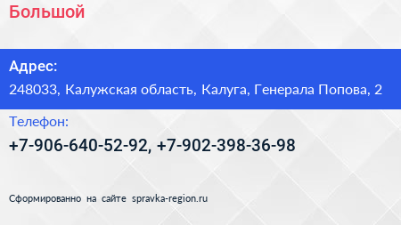 Большой по адресу 248033, Калужская область, Калуга, Генерала Попова, 2 в дальнейшем Организация, размещена в следующих категориях: