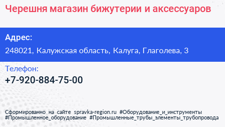 Черешня, магазин бижутерии и аксессуаров по адресу 248021, Калужская область, Калуга, Глаголева, 3 в дальнейшем Организация, размещена в следующих категориях: