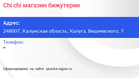 Chi chi, магазин бижутерии по адресу 248007, Калужская область, Калуга, Вишневского, 7 в дальнейшем Организация, размещена в следующих категориях: