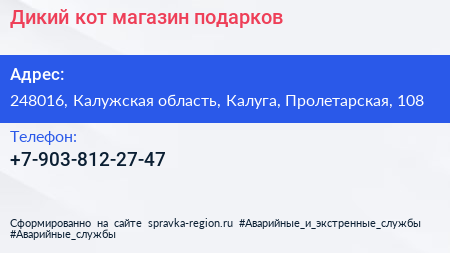 Дикий кот, магазин подарков по адресу 248016, Калужская область, Калуга, Пролетарская, 108 в дальнейшем Организация, размещена в следующих категориях:
