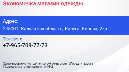 Экономочка, магазин одежды по адресу 248001, Калужская область, Калуга, Кирова, 25а в дальнейшем Организация, размещена в следующих категориях: