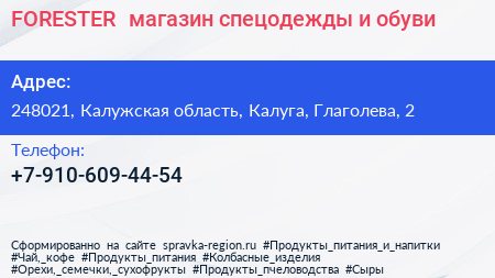 FORESTER+, магазин спецодежды и обуви по адресу 248021, Калужская область, Калуга, Глаголева, 2 в дальнейшем Организация, размещена в следующих категориях: