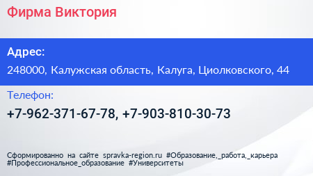 Фирма Виктория по адресу 248000, Калужская область, Калуга, Циолковского, 44 в дальнейшем Организация, размещена в следующих категориях: