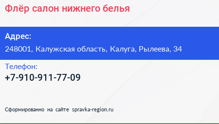 Флёр, салон нижнего белья по адресу 248001, Калужская область, Калуга, Рылеева, 34 в дальнейшем Организация, размещена в следующих категориях: