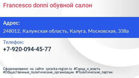 Francesco donni, обувной салон по адресу 248012, Калужская область, Калуга, Московская, 338а в дальнейшем Организация, размещена в следующих категориях: