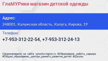 ГлаМУРики, магазин детской одежды по адресу 248001, Калужская область, Калуга, Кирова, 19 в дальнейшем Организация, размещена в следующих категориях: