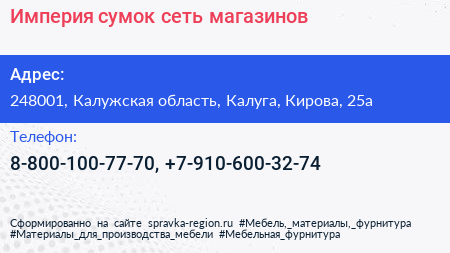 Империя сумок, сеть магазинов по адресу 248001, Калужская область, Калуга, Кирова, 25а в дальнейшем Организация, размещена в следующих категориях: