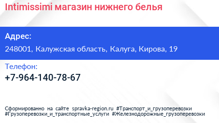 Intimissimi, магазин нижнего белья по адресу 248001, Калужская область, Калуга, Кирова, 19 в дальнейшем Организация, размещена в следующих категориях: