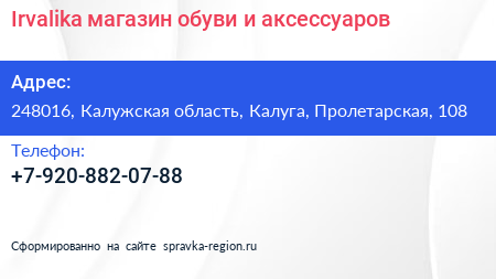 Irvalika, магазин обуви и аксессуаров по адресу 248016, Калужская область, Калуга, Пролетарская, 108 в дальнейшем Организация, размещена в следующих категориях:
