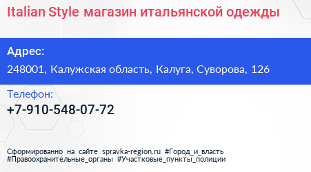 Italian Style, магазин итальянской одежды по адресу 248001, Калужская область, Калуга, Суворова, 126 в дальнейшем Организация, размещена в следующих категориях: