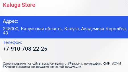 Kaluga Store по адресу 248000, Калужская область, Калуга, Академика Королёва, 43 в дальнейшем Организация, размещена в следующих категориях: