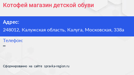 Котофей, магазин детской обуви по адресу 248012, Калужская область, Калуга, Московская, 338а в дальнейшем Организация, размещена в следующих категориях: