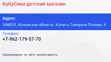 КуКуСики, детский магазин по адресу 248033, Калужская область, Калуга, Генерала Попова, 4 в дальнейшем Организация, размещена в следующих категориях: