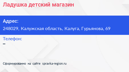 Ладушка, детский магазин по адресу 248029, Калужская область, Калуга, Гурьянова, 69 в дальнейшем Организация, размещена в следующих категориях: