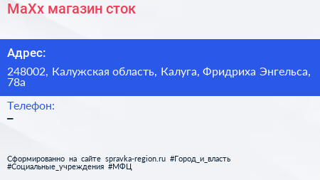 MaXx, магазин сток по адресу 248002, Калужская область, Калуга, Фридриха Энгельса, 78а в дальнейшем Организация, размещена в следующих категориях: