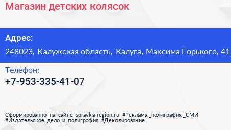 Магазин детских колясок по адресу 248023, Калужская область, Калуга, Максима Горького, 41 в дальнейшем Организация, размещена в следующих категориях: