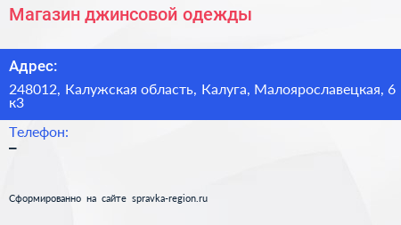 Магазин джинсовой одежды по адресу 248012, Калужская область, Калуга, Малоярославецкая, 6 к3 в дальнейшем Организация, размещена в следующих категориях: