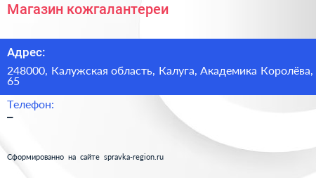 Магазин кожгалантереи по адресу 248000, Калужская область, Калуга, Академика Королёва, 65 в дальнейшем Организация, размещена в следующих категориях:
