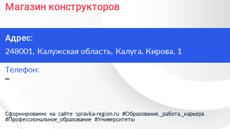 Магазин конструкторов по адресу 248001, Калужская область, Калуга, Кирова, 1 в дальнейшем Организация, размещена в следующих категориях: