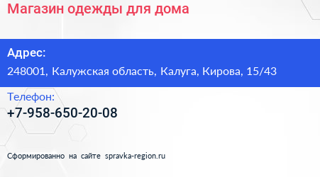 Магазин одежды для дома по адресу 248001, Калужская область, Калуга, Кирова, 15/43 в дальнейшем Организация, размещена в следующих категориях: