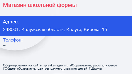 Магазин школьной формы по адресу 248001, Калужская область, Калуга, Кирова, 15 в дальнейшем Организация, размещена в следующих категориях: