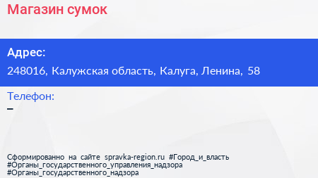 Магазин сумок по адресу 248016, Калужская область, Калуга, Ленина, 58 в дальнейшем Организация, размещена в следующих категориях: