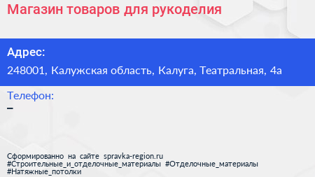 Магазин товаров для рукоделия по адресу 248001, Калужская область, Калуга, Театральная, 4а в дальнейшем Организация, размещена в следующих категориях: