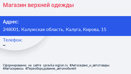 Магазин верхней одежды по адресу 248001, Калужская область, Калуга, Кирова, 15 в дальнейшем Организация, размещена в следующих категориях: