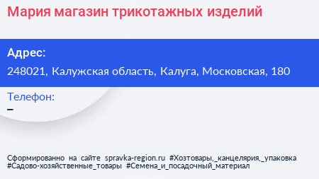 Мария, магазин трикотажных изделий по адресу 248021, Калужская область, Калуга, Московская, 180 в дальнейшем Организация, размещена в следующих категориях: