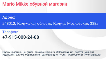 Mario Mikke, обувной магазин по адресу 248012, Калужская область, Калуга, Московская, 338а в дальнейшем Организация, размещена в следующих категориях:
