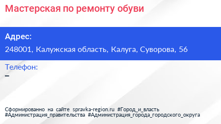 Мастерская по ремонту обуви по адресу 248001, Калужская область, Калуга, Суворова, 56 в дальнейшем Организация, размещена в следующих категориях: