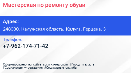Мастерская по ремонту обуви по адресу 248030, Калужская область, Калуга, Герцена, 3 в дальнейшем Организация, размещена в следующих категориях:
