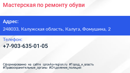 Мастерская по ремонту обуви по адресу 248033, Калужская область, Калуга, Фомушина, 2 в дальнейшем Организация, размещена в следующих категориях: