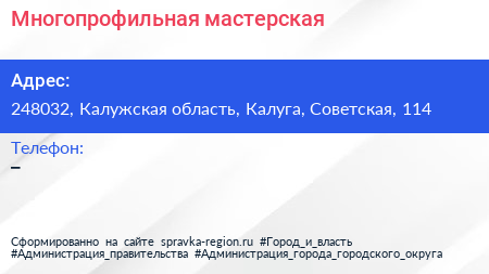 Многопрофильная мастерская по адресу 248032, Калужская область, Калуга, Советская, 114 в дальнейшем Организация, размещена в следующих категориях:
